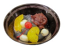 Аммицу - это десерт, который состоит из сладкой пасты из фасоли, рисовых пельменей, фруктов и кубиков агар-агара, заправленных коричневым сахарным сиропом. Он также может содержать шарик мороженого, в этом случае его называют "крем-аммицу".